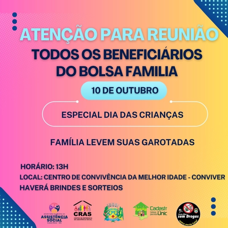 O secretário-adjunto de Assistência Social, Limiro Paulino Neto, convoca todos os beneficiários cadastrados em Costa Rica e tem um pedido especial, que levem suas crianças pois haverá brindes e sorteios para marcar o Dia da Criança que é celebrado em 12 de outubro. Essas reuniões são essenciais para discutir temas relevantes que impactam diretamente a vida das famílias beneficiárias.