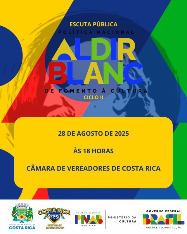 A Prefeitura de Costa Rica, por meio da Secretaria de Esporte e Cultura, em parceria com o Governo Federal e o Ministério da Cultura, promoverá uma Escuta Pública da Política Nacional Aldir Blanc. O evento acontecerá na Câmara de Vereadores no dia 28 de agosto de 2025, às 18h. O objetivo é discutir o Ciclo II de fomento à cultura e reunir a comunidade para contribuir com ideias e propostas.