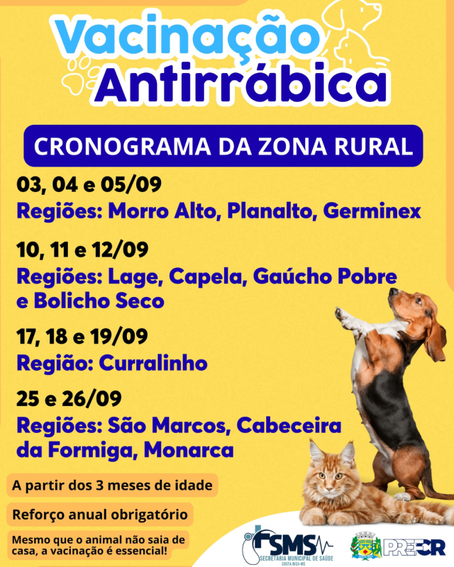 As vacinas serão aplicadas em diferentes regiões do município em datas específicas. De 3 a 5 de setembro, a vacinação ocorrerá nas regiões do Morro Alto, Planalto e Germinex. Já de 10 a 12, será a vez das localidades de Lage, Capela, Gaúcho Pobre e Bolicho Seco. As regiões do Curralinho receberão a vacinação de 17 a 19 de setembro, enquanto as áreas da São Marcos, Cabeceira da Formiga e Monarca serão atendidas nos dias 25 e 26.