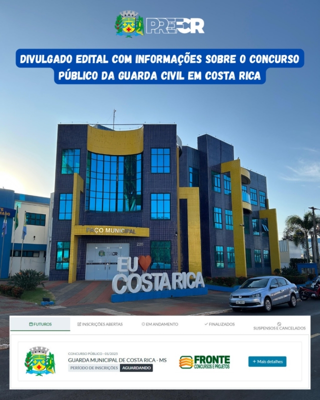A Prefeitura Municipal de Costa Rica/MS anunciou nesta terça-feira, 8 de julho, o Concurso Público nº 01/2025, que será realizado pela Fronte Concursos e Projetos LTDA, para selecionar Guarda Civis. As inscrições ocorrerão de 11 de julho a 10 de agosto de 2025, exclusivamente online, com taxa de R$ 100,00.