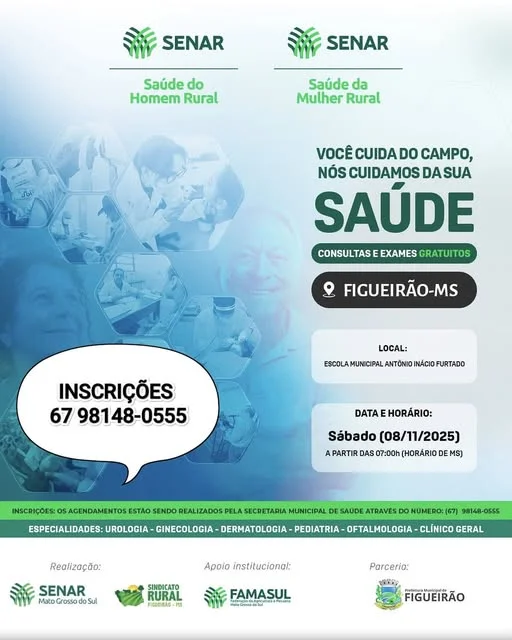 A Prefeitura Municipal de Figueirão, em parceria com o SENAR – Serviço Nacional de Aprendizagem Rural, o Sindicato Rural da Famasul e a Secretaria Municipal de Saúde, convida toda a população para participar do projeto social “Você cuida do campo, nós cuidamos da sua saúde”.