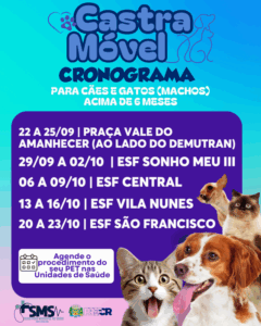 A Prefeitura de Costa Rica via Secretaria Municipal de Saúde (SMS) e da Vigilância Sanitária, divulgou o cronograma do Castramóvel para setembro e outubro de 2025. A unidade atenderá cães e gatos machos com mais de seis meses em várias locais da cidade.